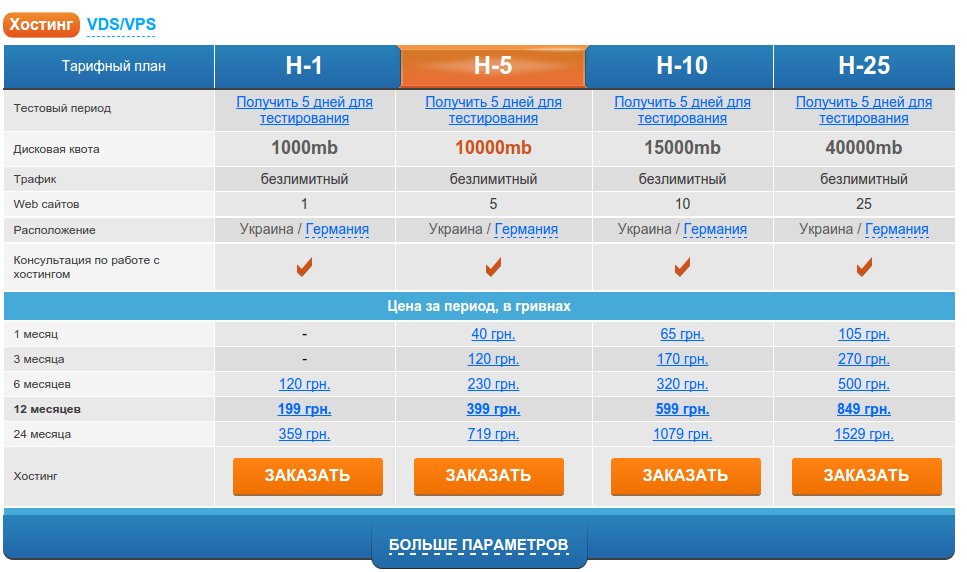 Если перевести на доллары (как сейчас без этого, когда и рубль и гривна в ауте), то тариф H-5 стоит 1.5 доллара. Есть и меньший тариф, но это ни о чем. Много это или мало, полтора доллара, или 90 русских рублей? Нет, это не много. К тому же, если заплатить за год вперед, то можно сэкономить 100 гривен. Почти бесплатный украинский хостинг...